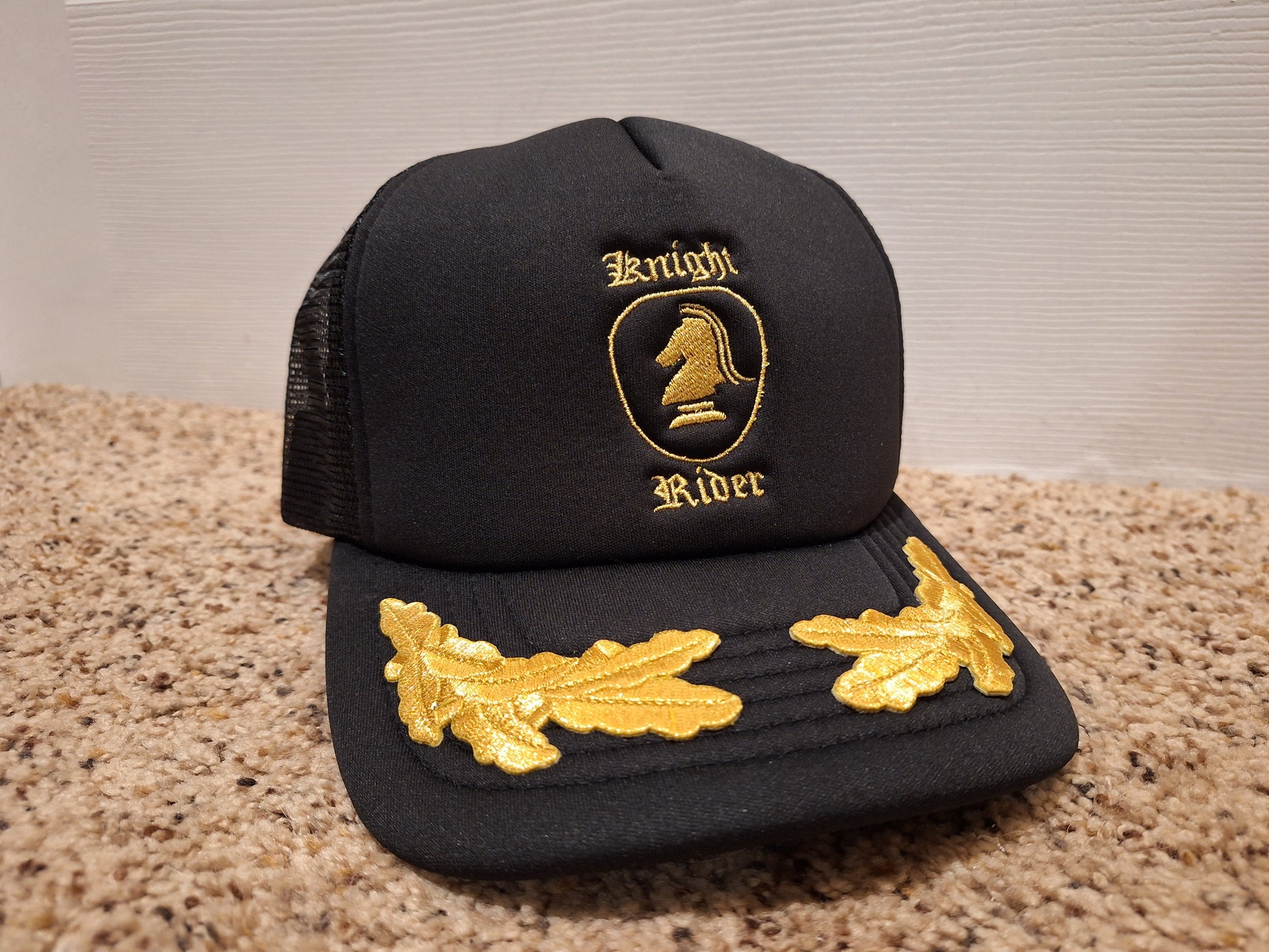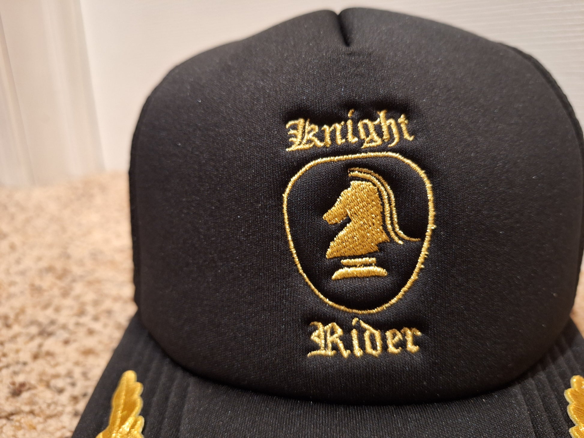 One of the most sought after pieces of cast/crew memorabilia is the Knight Shield crew hat, given to all members of the "Knight Rider" family during the filming of the series. Now available for the first time is this authentic replica of those famous crew hats! We copied both the look, feel and texture of those original hats, starting with a black mesh trucker's hat back, a puffy (very 80's!) foam black fabric on the front and bill and metallic gold stitching of the unique Knight Rider chess piece and logo! But, we didn't stop there! Some of the original crew hats were adorned with gold metallic iron-on "scrambled egg" patches that are affixed to the bill. You will receive a set of these patches that you can iron-on if you so desire, or leave them off for a more simple look. Ironing them on takes only seconds! VERY limited quantities!